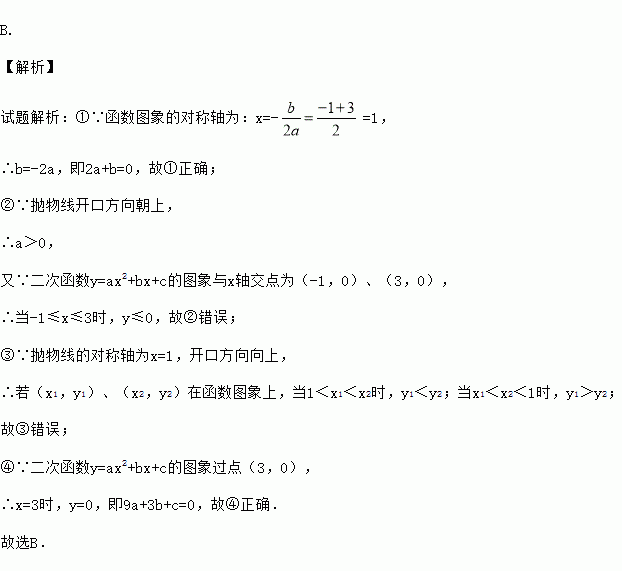 二次函数y=ax2+bx+c(a≠0)的图象如图所示,下列说法:①2a+b=0②当-1≤x≤3时,y<0③若(x1,y1)、(x2,y2)在函数图象上,当x1<x2时,y1<y2④9a+3b+c=0其中正确的是( )
