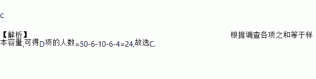 C 【解析】根据调查各项之和等于样本容量,可得D项的人数=50-6-10-6-4=24,故选C.