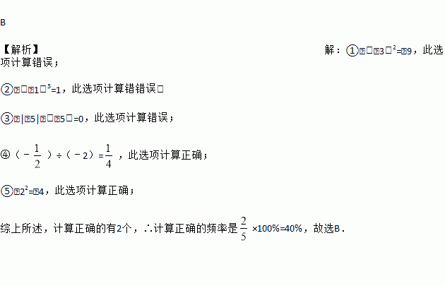 B 【解析】【解析】 ①﹣(﹣3)2=﹣9,此选项计算错误; ②﹣(﹣1)3=1,此选项计算错错误; ③﹣|﹣5|﹣(﹣5)=0,此选项计算错误; ④(﹣)÷(﹣2)=,此选项计算正确; ⑤﹣22=﹣4,此选项计算正确; 综上所述,计算正确的有2个,∴计算正确的频率是×100%=40%,故选B.