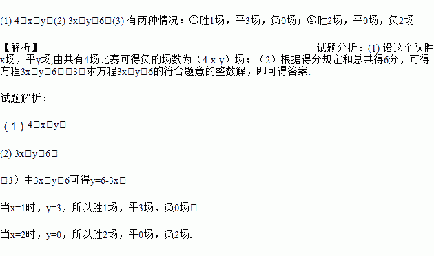 足球比赛中规定:胜一场得3分,平一场得1分,负一场得0分.某足球队在4场比赛中共得6分,设这个队胜x场,平y场.