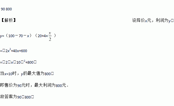 90 800 【解析】设降价x元,利润为y, y=(100-70-x)(20+4×) =-2x2+40x+600 =-2(x-10)2+800, 当x=10时,y的最大值为800, 即售价为90元时,最大利润为800元. 故答案为90,800.