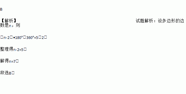 B 【解析】试题解析:设多边形的边数是n,则 (n-2)•180°:360°=5:2, 整理得n-2=5, 解得n=7. 故选B.