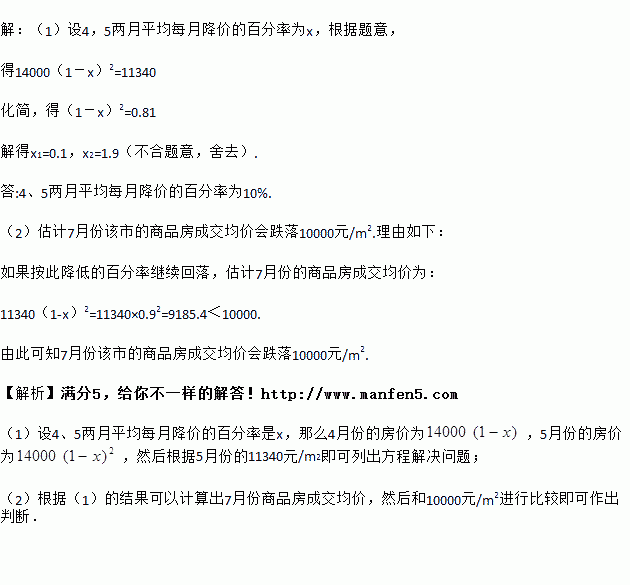 (2)如果房价继续回落,按此降价的百分率,你预测到7月分该市的商品房成交均价是否会跌破3000元/m2?请说明理由.
