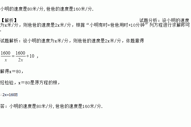 小明的速度是80米/分,爸爸的速度是160米/分. 【解析】试题分析:设小明的速度为x米/分,则爸爸的速度是2x米/分,根据“小明有时=爸爸用时+10分钟”列方程进行求解即可. 试题解析:设小明的速度为x米/分,则爸爸的速度是2x米/分,依题意得 , 解得x=80, 经检验,x=80是原方程的根, ∴2x=160, 答:小明的速度是80米/分,爸爸的速度是...