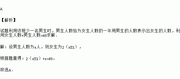 希望中学九年级1班共有学生49人,当该班少一名男生时,男生的人数恰好为女生人数的一半.设该班有男生x人,则下列方程中,正确的是( )