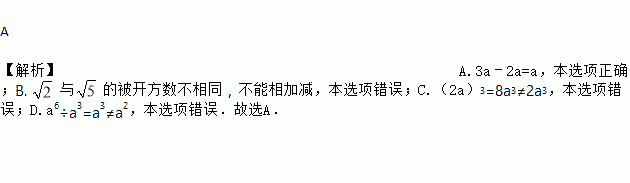 A. 3a﹣2a=a B. C. (2a)3=2a3 D. a6÷a3=a2