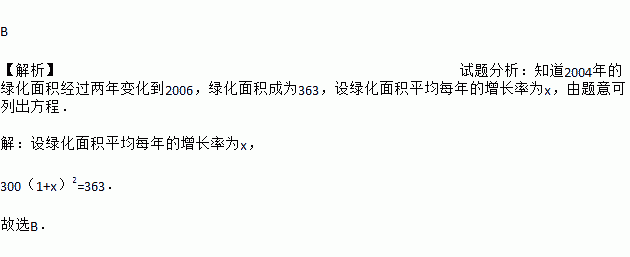 B 【解析】试题分析:知道2004年的绿化面积经过两年变化到2006,绿化面积成为363,设绿化面积平均每年的增长率为x,由题意可列出方程. 【解析】 设绿化面积平均每年的增长率为x, 300(1+x)2=363. 故选B.
