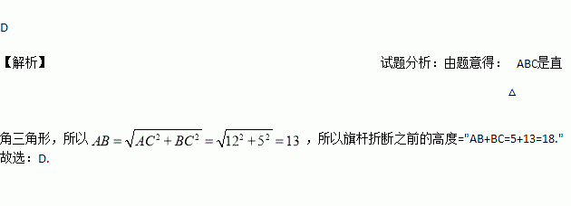 如图,一根垂直于地面的旗杆在离地面5m处撕裂折断,旗杆顶部落在离旗杆底部12m处,旗杆折断之前的高度是( )
