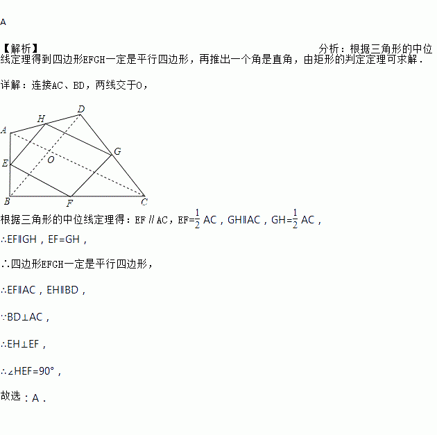 如图,E、F、G、H分别是四边形ABCD四条边的中点,要使四边形EFGH为矩形,四边形ABCD应具备的条件是( )