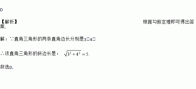 D 【解析】根据勾股定理即可得出答案. 【解析】 ∵直角三角形的两条直角边长分别是3,4, ∴该直角三角形的斜边长是: 故选D.