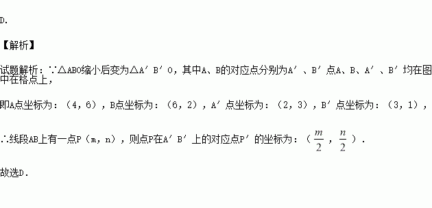 如图,△ABO缩小后变为△A′B′O,其中A、B的对应点分别为A′、B′点A、B、A′、B′均在图中在格点上.若线段AB上有一点P(m,n),则点P在A′B′上的对应点P′的坐标为( )