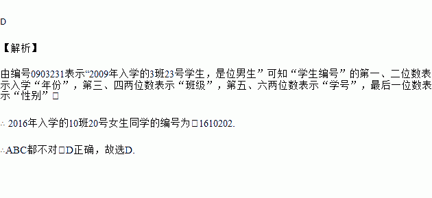 为便于管理,我校决定给每个学生编号.设定末尾用1表示男生,2表示女生.如果编号0903231表示“2009年入学的3班23号学生,是位男生”,那么2016年入学的10班20号女生同学的编号为( )