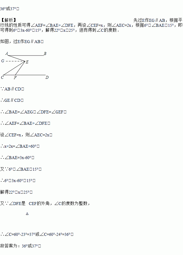 如图,已知AB∥CD,F为CD上一点,∠EFD=60°,∠AEC=2∠CEF,若6°<∠BAE<15°,∠C的度数为整数,则∠C的度数为_____.