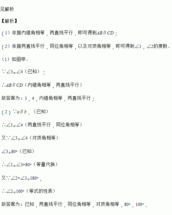(2)如图乙,已知直线a∥b,∠3=80°,求∠1,∠2的度数.