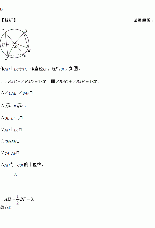 如图,半径为5的⊙A中,弦BC,ED所对的圆心角分别是∠BAC,∠EAD.已知DE=6,∠BAC+∠EAD=180°,则弦BC的弦心距等于( )
