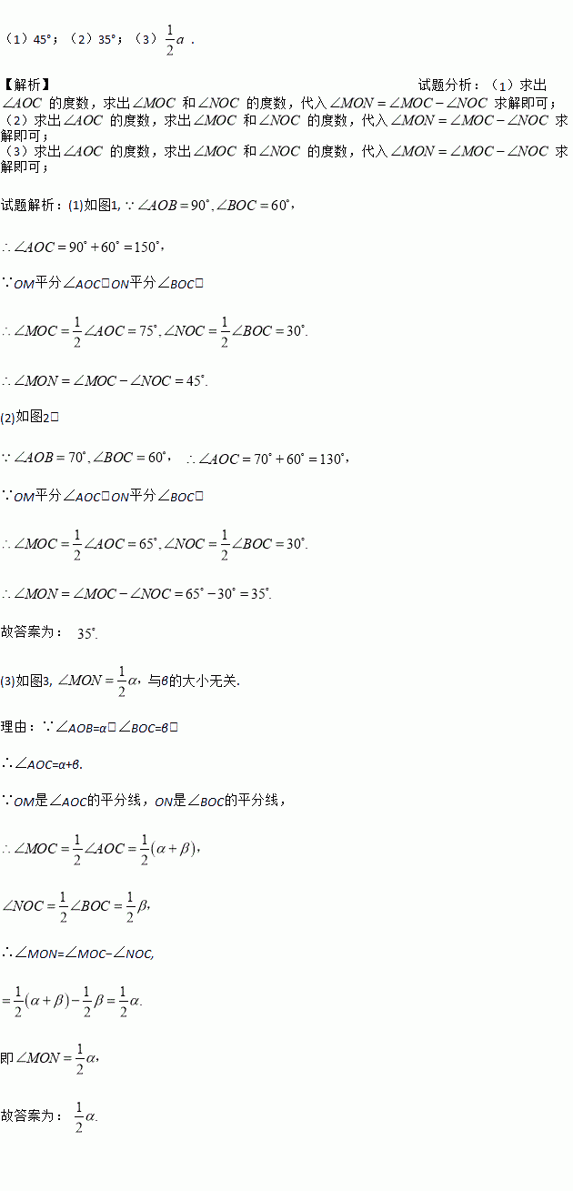 (3)如图3,当∠AOB=α,∠BOC=β时,猜想:∠MON= (直接写出结果).