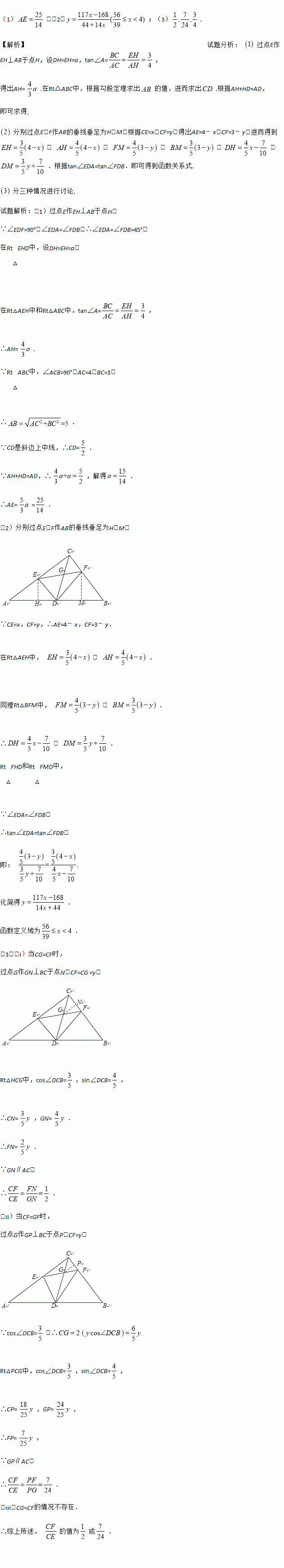 (1);(2);(3). 【解析】试题分析: 过点E作EH⊥AB于点H,设DH=EH=a,tan∠A=, 得出AH= .在Rt△ABC中,根据勾股定理求出的值,进而求出.根据AH+HD=AD, 即可求得. 分别过点E、F作AB的垂线垂足为H、M,根据CE=x,CF=y,得出AE=4x,CF=3y.进而得到, . , . , .根据tan∠EDA=tan∠FDB.即可得到函数...