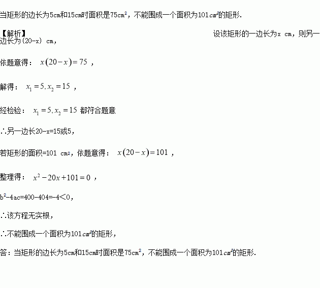 用一条长40cm的绳子怎样围成一个面积为75cm2的矩形?能围成一个面积为101cm2的矩形吗?如能,说明围法;如不能,说明理由.
