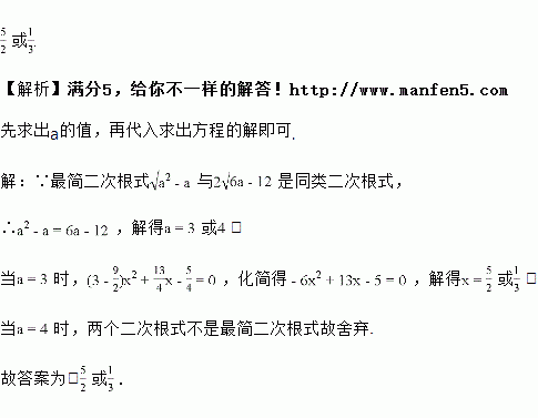 已知最简二次根式与是同类二次根式,求关于的一元二次方程的解.