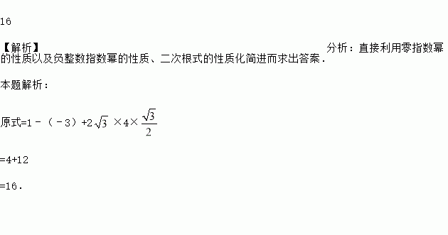 计算:(3﹣π)0﹣(﹣)﹣1+×4sin60°.