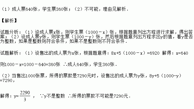 (1)成人票640张,学生票360张;(2)不可能,理由见解析. 【解析】 试题分析:(1)设成人票x张,则学生票(1000-x)张,根据题意列出方程进行求解,得出答案;(2)设成人票y张,则学生票(1000-y)张,然后根据题意列出方程求出y的值,看y是否为整数,如果是整数则符合条件,如果不是整数则不符合条件. 试题解析:(1)设售出的成人票为x张,根据题意得:8x+5(100...