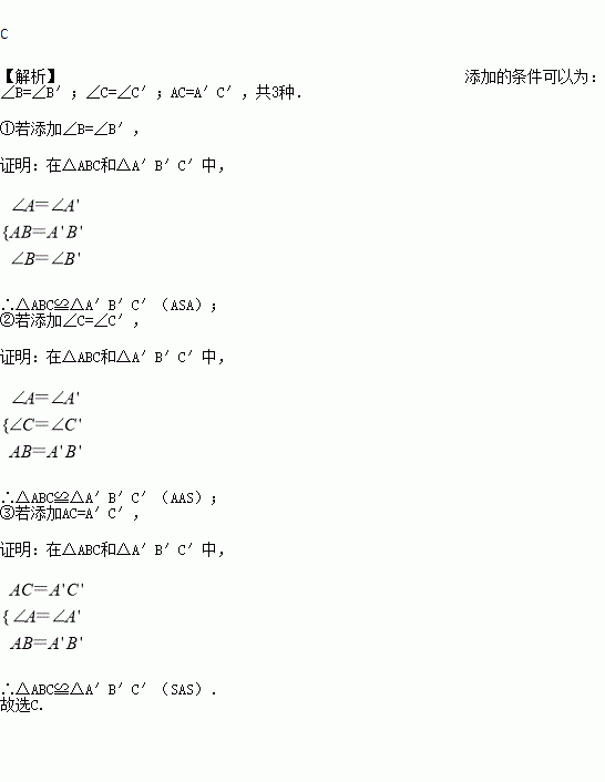 如图:AB=A′B′,∠A=∠A′,若△ABC≌△A′B′C′,则还需添加的一个条件有( )种.