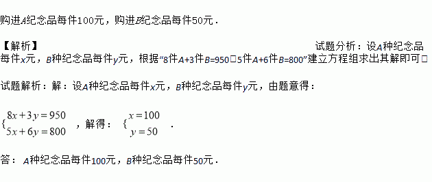 为了抓住文化艺术节的商机,某商店决定购进A,B两种艺术节纪念品.若购进A种纪念品8件,B种纪念品3件,需要950元;若购进A种纪念品5件,B种纪念品6件,需要800元.求购进A,B两种纪念品每件各需多少元?