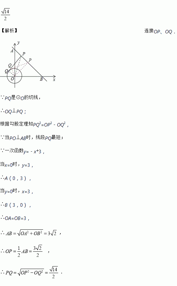 如图,已知一次函数y=﹣x+3的图象与坐标轴分别交于点A,B两点,⊙O的半径为1,P是线段AB上的一个点,过点P作⊙O的切线PQ,切点为Q,则PQ的最小值为_____.
