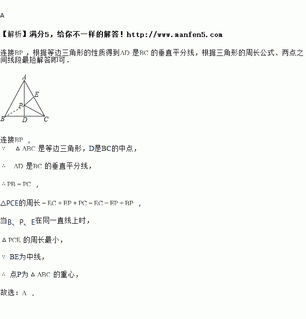 如图所示,在等边△ABC中,D,E分别是BC,AC的中点,点P是线段AD上的一个动点,当△PCE的周长最小时,P点的位置在( )