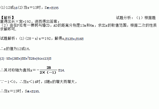 在美化校园的活动中,某兴趣小组想借助如图所示的直角墙角(两边足够长),用28m长的篱笆围成一个矩形花园ABCD(篱笆只围AB、BC两边),设AB=xm.