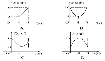 如图,正方形ABCD中,AB=8cm,对角线AC、BD相交于点O,点E、F分别从B、C两点同时出发,以1cm/s的速度沿BC、CD运动,到点C、D时停止运动,设运动时间为t(s),△OEF的面积为S(cm2),则S(cm2)与t(s)的函数关系可用图象表示为( )