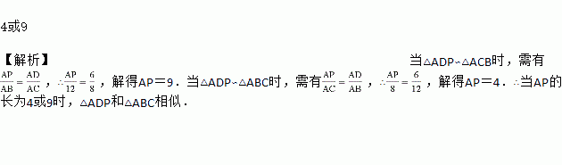 如图,已知△ABC中,D为边AC上一点,P为边AB上一点,AB=12,AC=8,AD=6,当AP的长度为__时,△ADP和△ABC相似.
