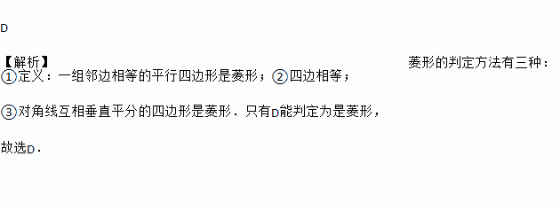 D 【解析】菱形的判定方法有三种:①定义:一组邻边相等的平行四边形是菱形;②四边相等; ③对角线互相垂直平分的四边形是菱形.只有D能判定为是菱形, 故选D.