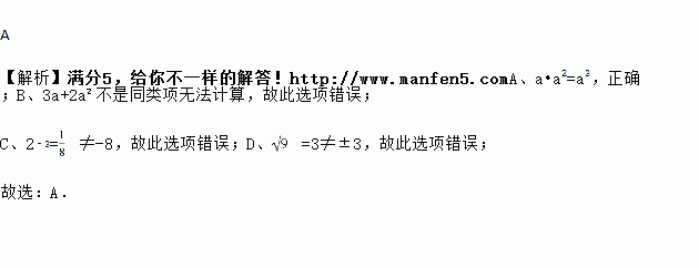 A. a•a2=a3 B. 3a+2a2=5a2 C. 2﹣3=﹣8 D.