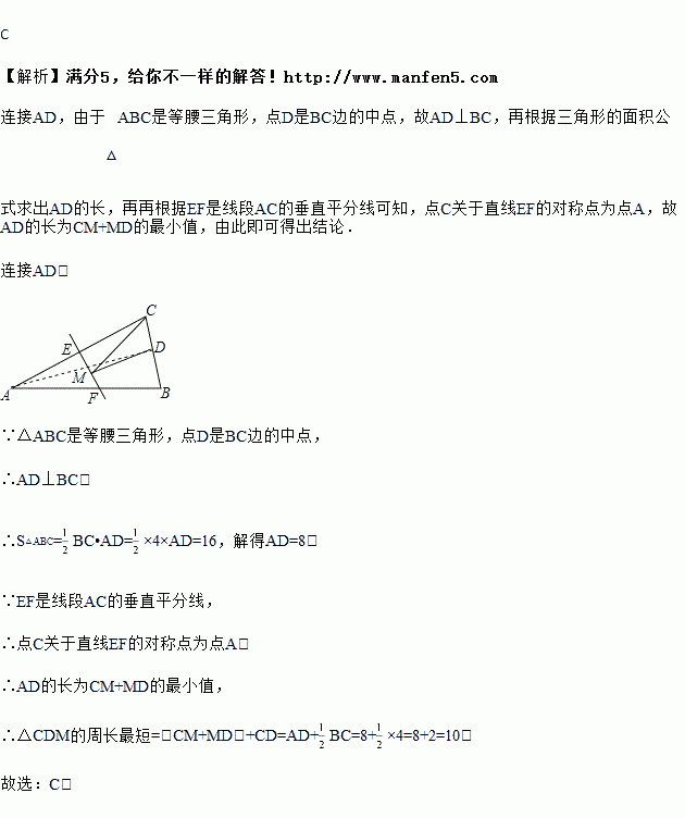 如图,等腰三角形ABC的底边BC长为4,面积是16,腰AC的垂直平分线EF分别交AC,AB边于E,F点若点D为BC边的中点,点M为线段EF上一动点,则![]()