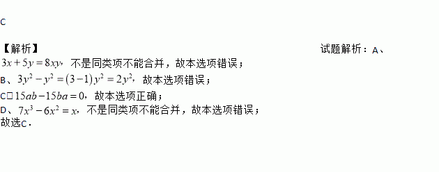 C 【解析】试题解析:A、 不是同类项不能合并,故本选项错误; B、 故本选项错误; C、 故本选项正确; D、 不是同类项不能合并,故本选项错误; 故选C.