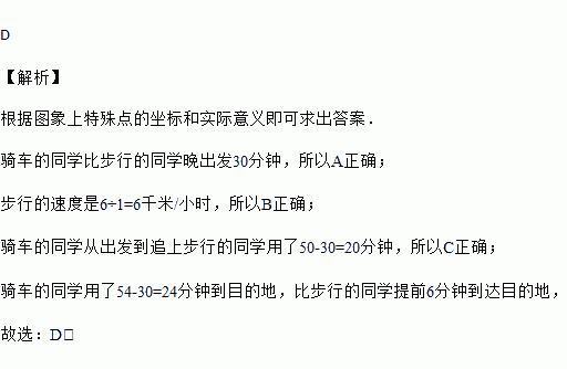 A. 骑车的同学比步行的同学晚出发30分钟 B. 步行的速度是6千米/小时