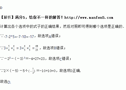 C. -22-(-3)3=31 D. 2×(-5)-5÷=0