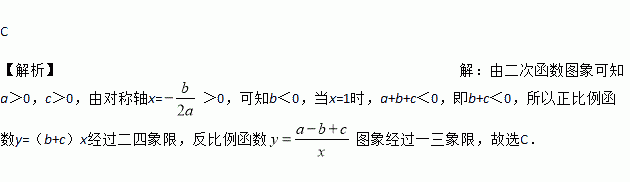 已知二次函数y=ax2+bx+c(a≠0)的图象如图所示,则正比例函数y=(b+c)x与反比例函数y=在同一坐标系中的大致图象是( )