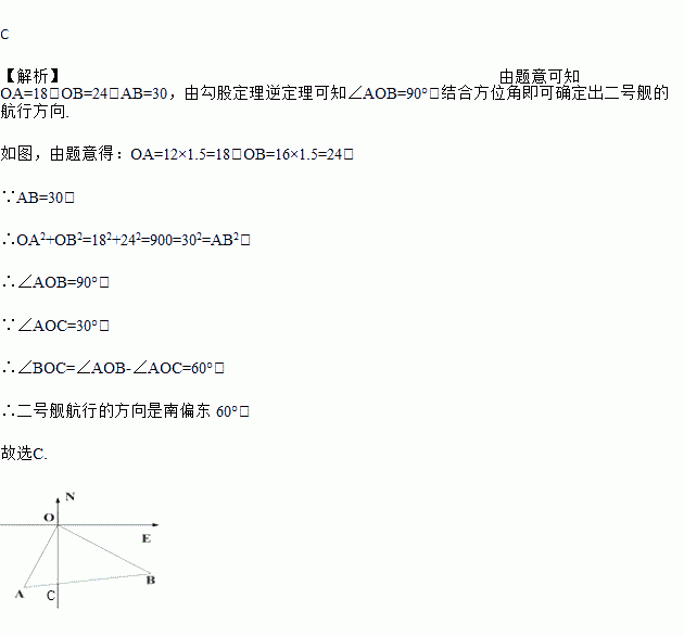 如图,中俄“海上联合—2017”军事演习在海上编队演习中,两艘航母护卫舰从同一港口O同时出发,一号舰沿南偏西30°方向以12海里/小时的速度航行,二号舰以16海里/小时速度航行,离开港口1.5小时后它们分别到达A,B两点,相距30海里,则二号舰航行的方向是( )