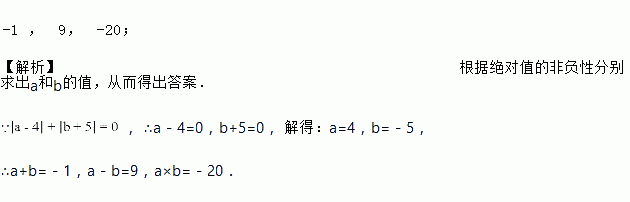 如果|a-4|+|b+5|=0,则a+b=_______,a-b=_______,a×b=________.