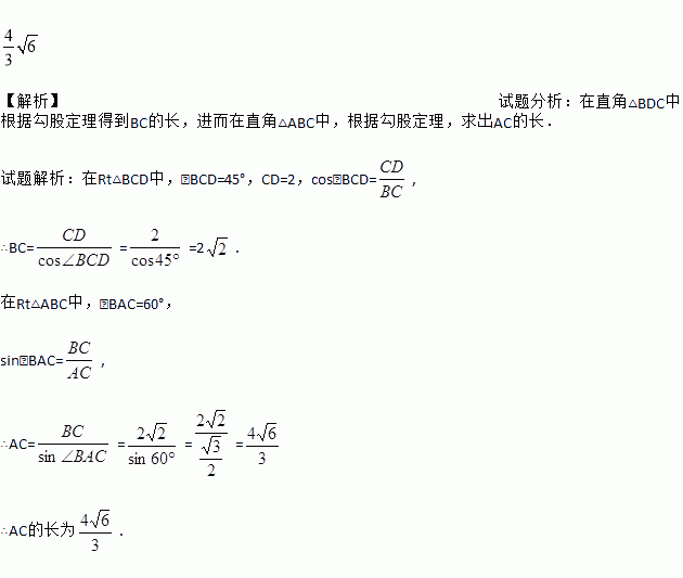 小明将一副三角板按如图所示摆放在一起,发现只要知道其中一边的长就可以求出其他各边的长,若已知CD=2,求AC的长.