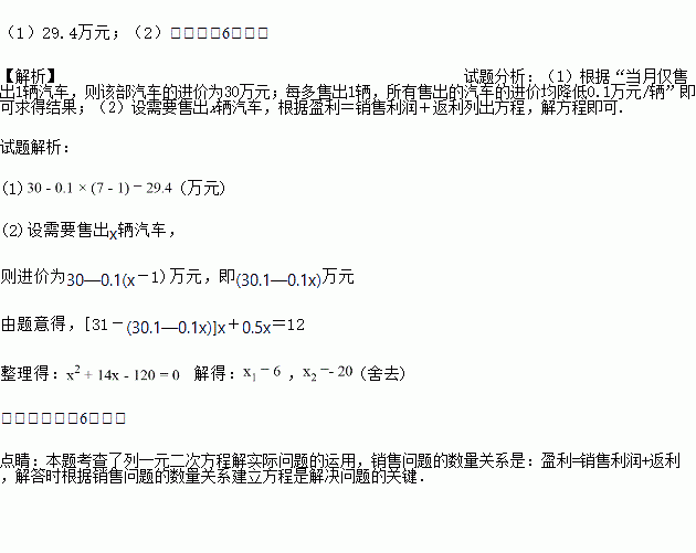 (2)如果汽车的售价为每辆31万元,该公司计划当月盈利12万元,那么需要售出多少辆汽车?(盈利=销售利润+返利)