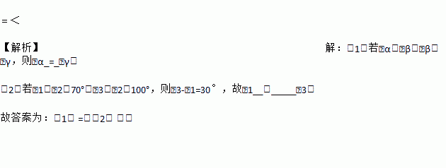 = < 【解析】【解析】 (1)若∠α=∠β,∠β=∠γ,则∠α_=_∠γ; (2)若∠1+∠2=70°,∠3+∠2=100°,则∠3-∠1=30°,故∠1__<_____∠3. 故答案为:(1) =;(2) <.