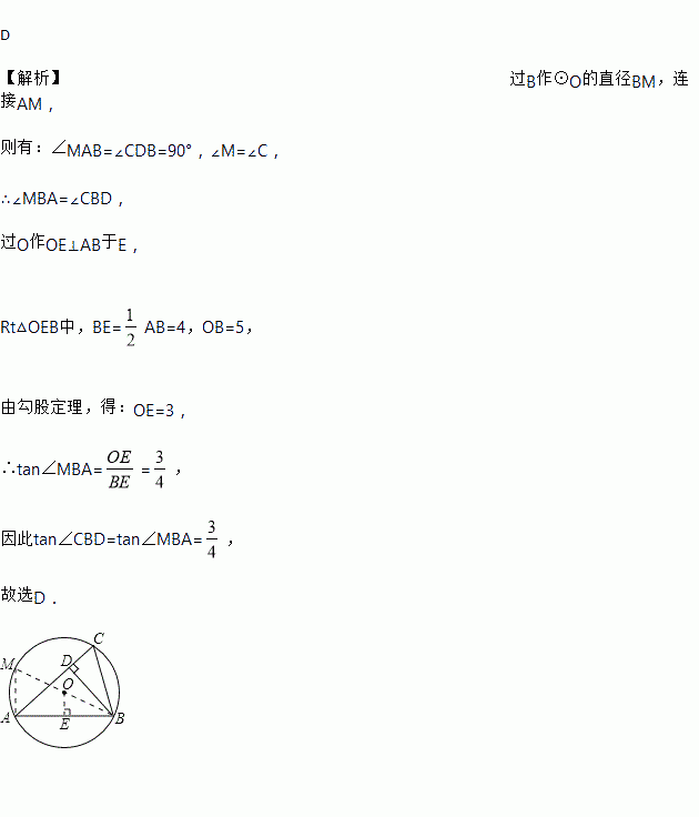 如图,已知⊙O的半径为5,锐角△ABC内接于⊙O,BD⊥AC于点D,AB=8,则tan∠CBD的值等于( )
