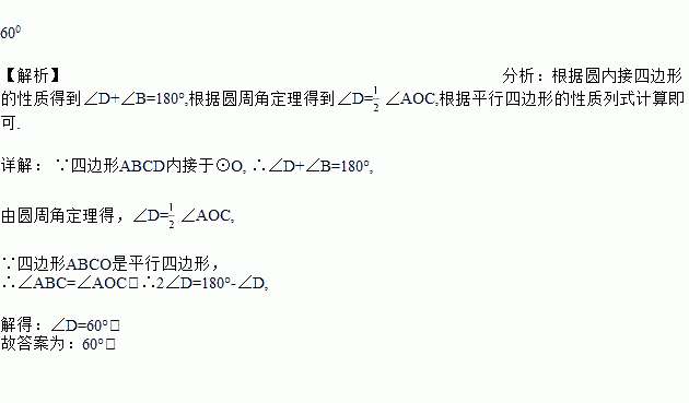 如图,四边形ABCD内接于,若四边形ABCO是平行四边形,则的大小为_______.