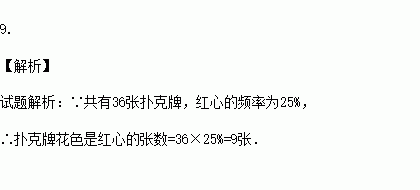 含有4种花色的36张扑克牌的牌面都朝下,每次抽出一张记下花色后再原样放回,洗匀牌后再抽.不断重复上述过程,记录抽到红心的频率为25%,那么其中扑克牌花色是红心的大约有________张。