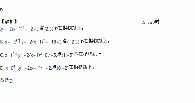 D 【解析】A. x=2时,y=?2(x?1)²=?2≠3,点(2,3)不在抛物线上, B. x=?2时,y=?2(x?1)²=?18≠3,点(?2,3)不在抛物线上, C. x=1时,y=?2(x?1)²=0≠?5,点(1,?5)不在抛物线上, D. x=0时,y=?2(x?1)²=?2,点(0,?2)在抛物线上, 故选D.