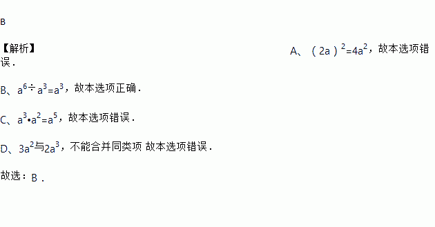 A. (2a)2=2a2 B. a6÷a3=a3 C. a3•a2=a6 D. 3a2+2a3=5a5