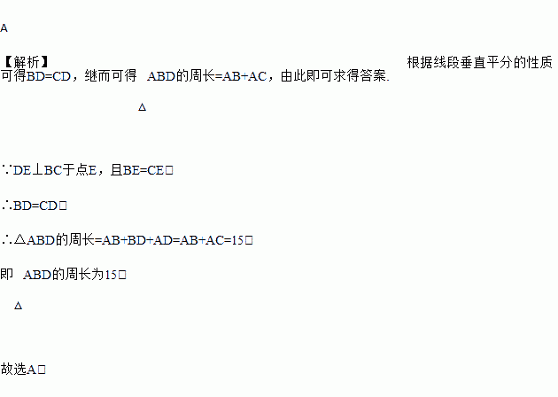 如图,DE⊥BC于点E,且BE=CE,AB+AC=15,则△ABD的周长为( )